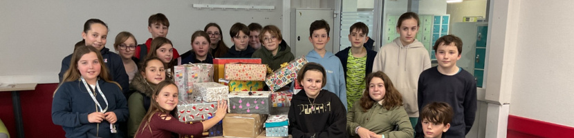 Dans le cadre du parcours citoyen, et après proposition au sein du conseil coopératif, la 6D a confectionné, en partenariat avec les « Restos du Cœur », des boîtes de Noël solidaires en direction d’enfants ou d’adultes qui n’ont pas la chance d’avoir des cadeaux à Noël.